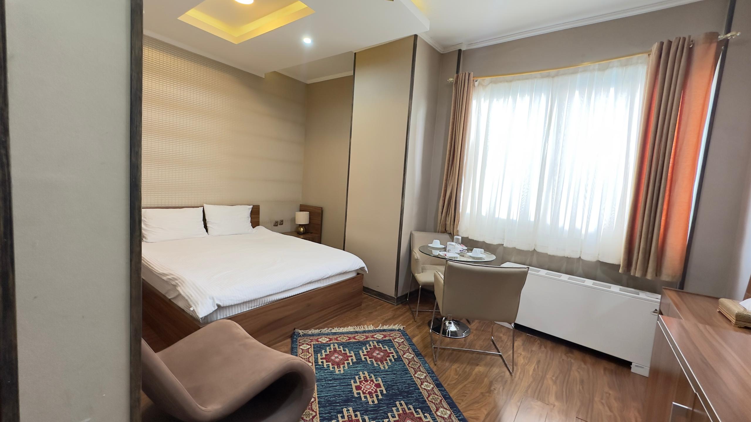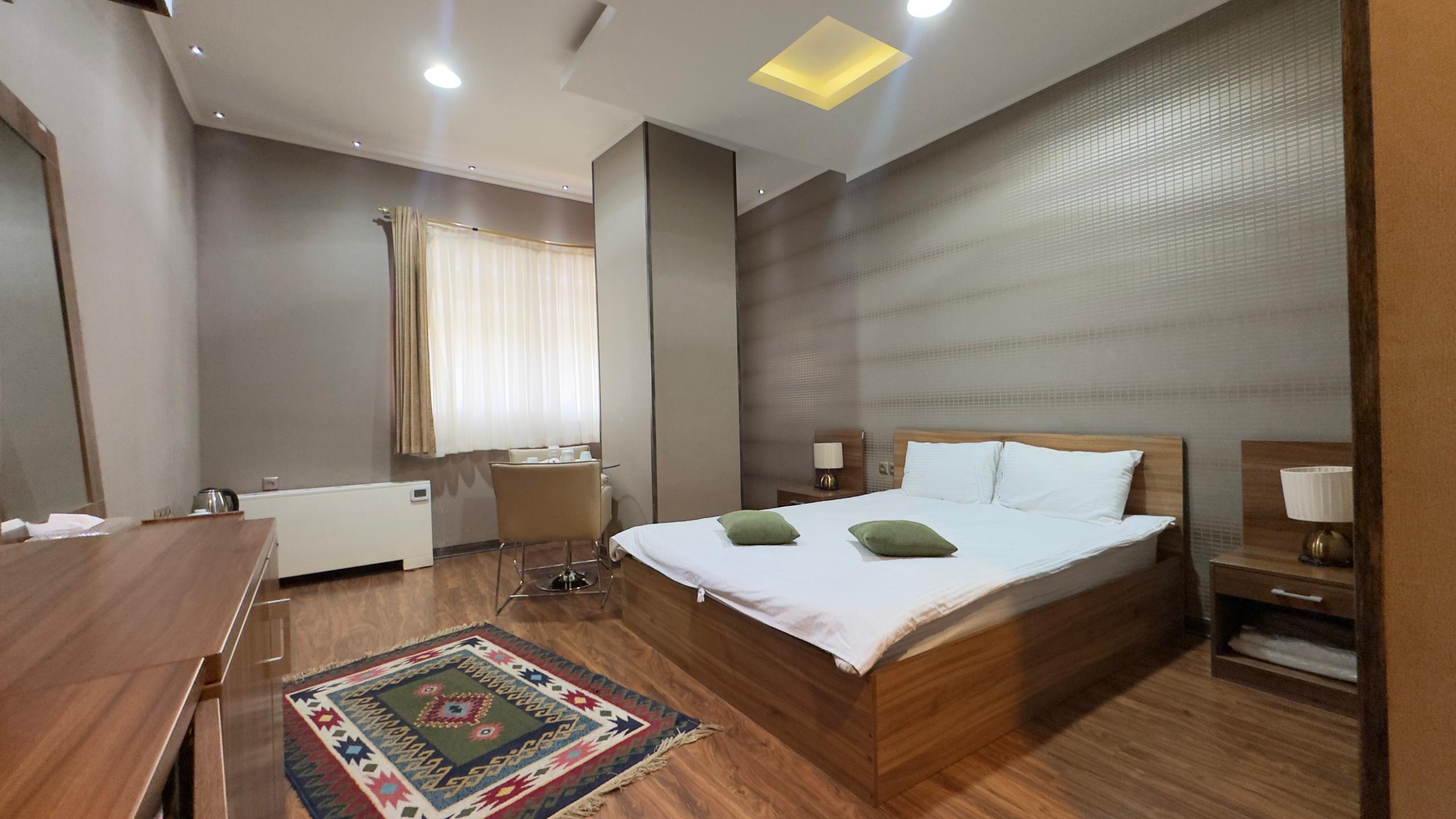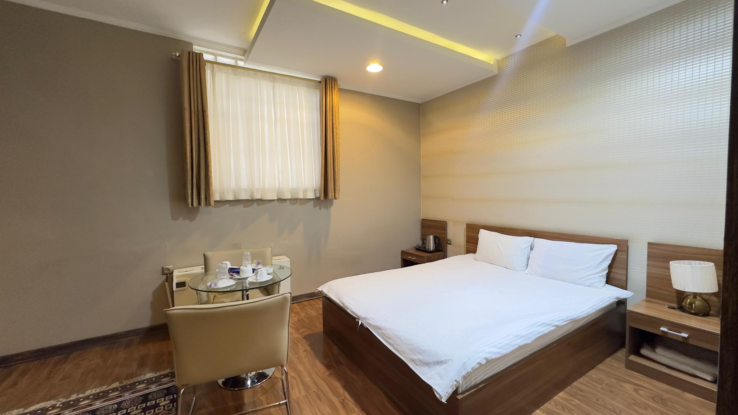 این اتاق شامل یک تخت دو نفره همراه با دمپایی ، حوله ، مینی بار یخچال ، سرویس چای و توالت فرنگی ( توالت ایرانی در سالن ) واقع در طبقه 4 هتل و خانه داری 24 ساعته