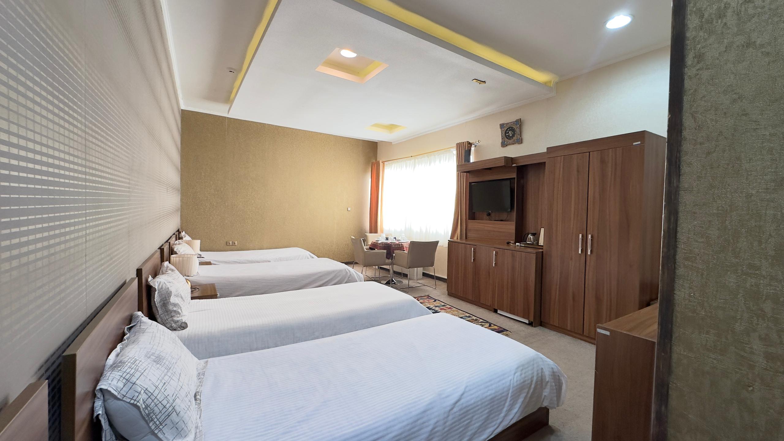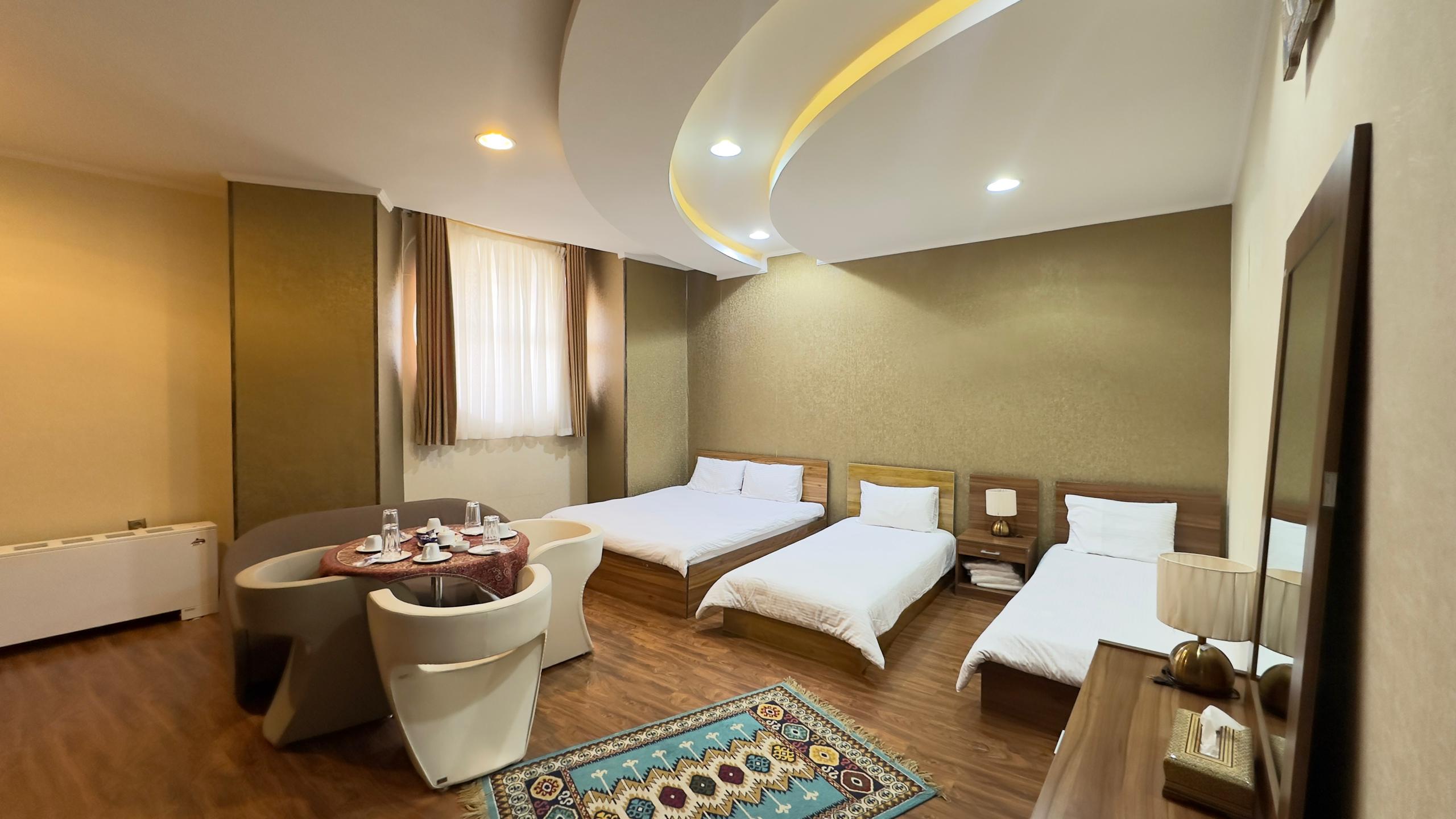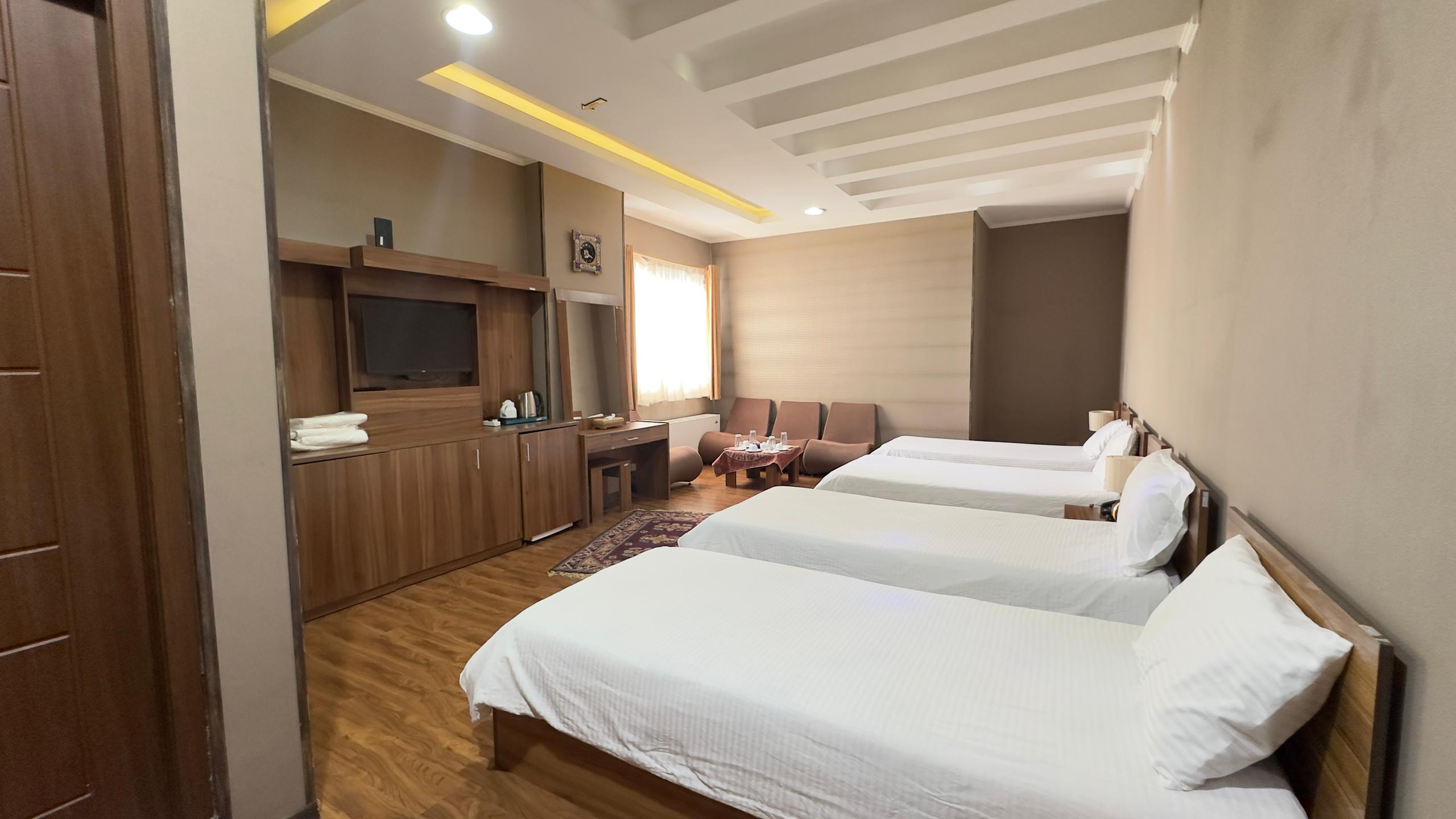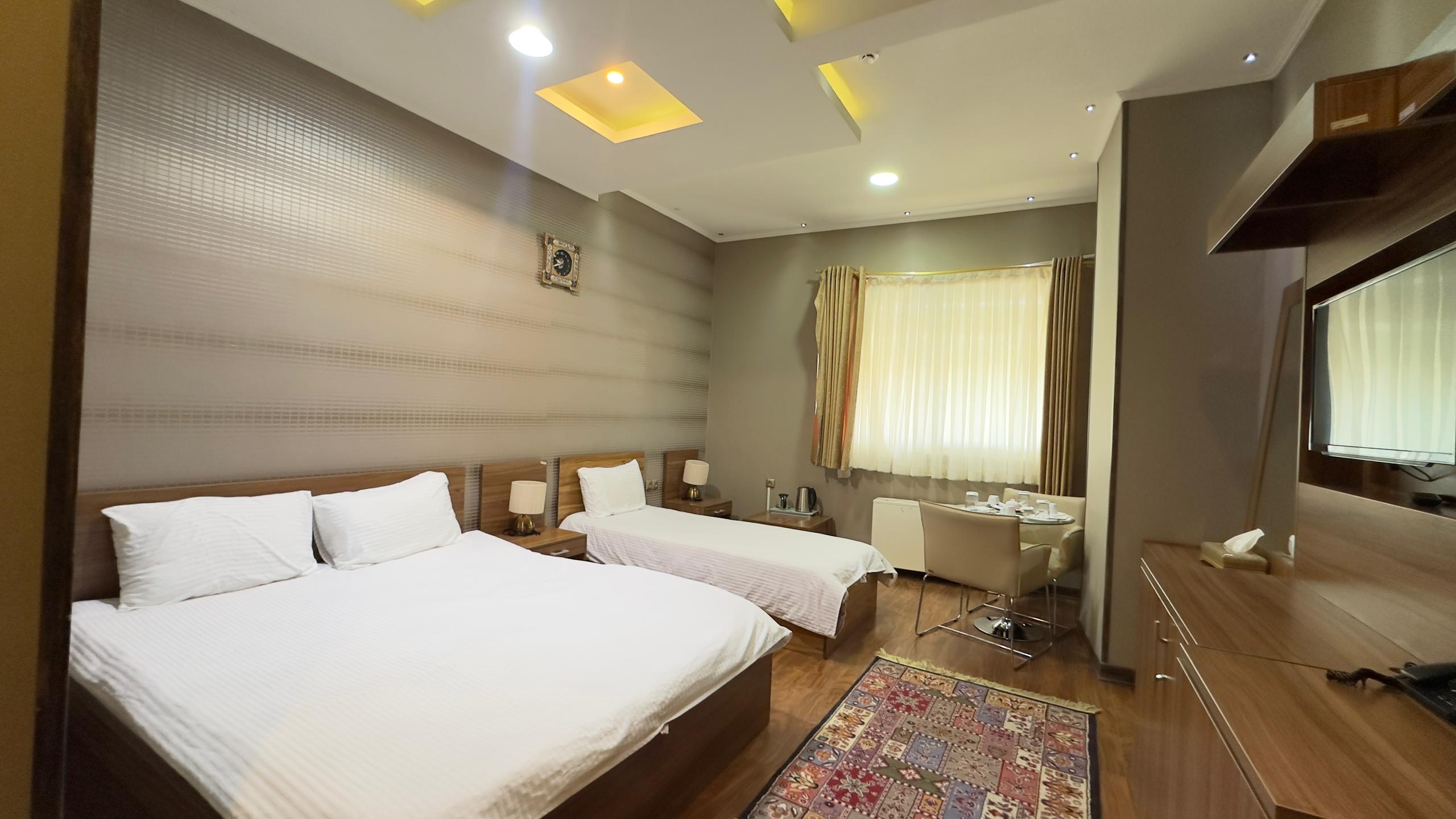 این اتاق شامل یک تخت دبل و دو تخت سینگل همراه با دمپایی ، حوله ، مینی بار یخچال ، سرویس چای و توالت فرنگی ( توالت ایرانی در سالن ) واقع در طبقه 4 هتل و خانه داری 24 ساعته