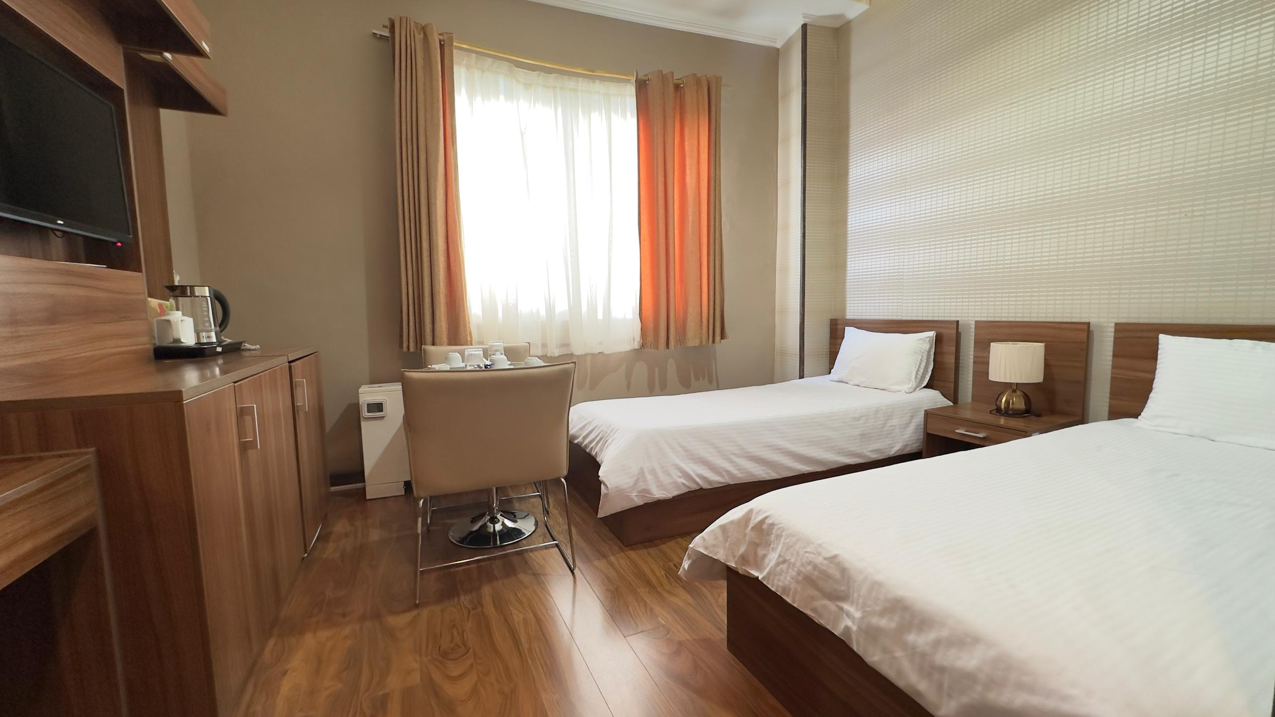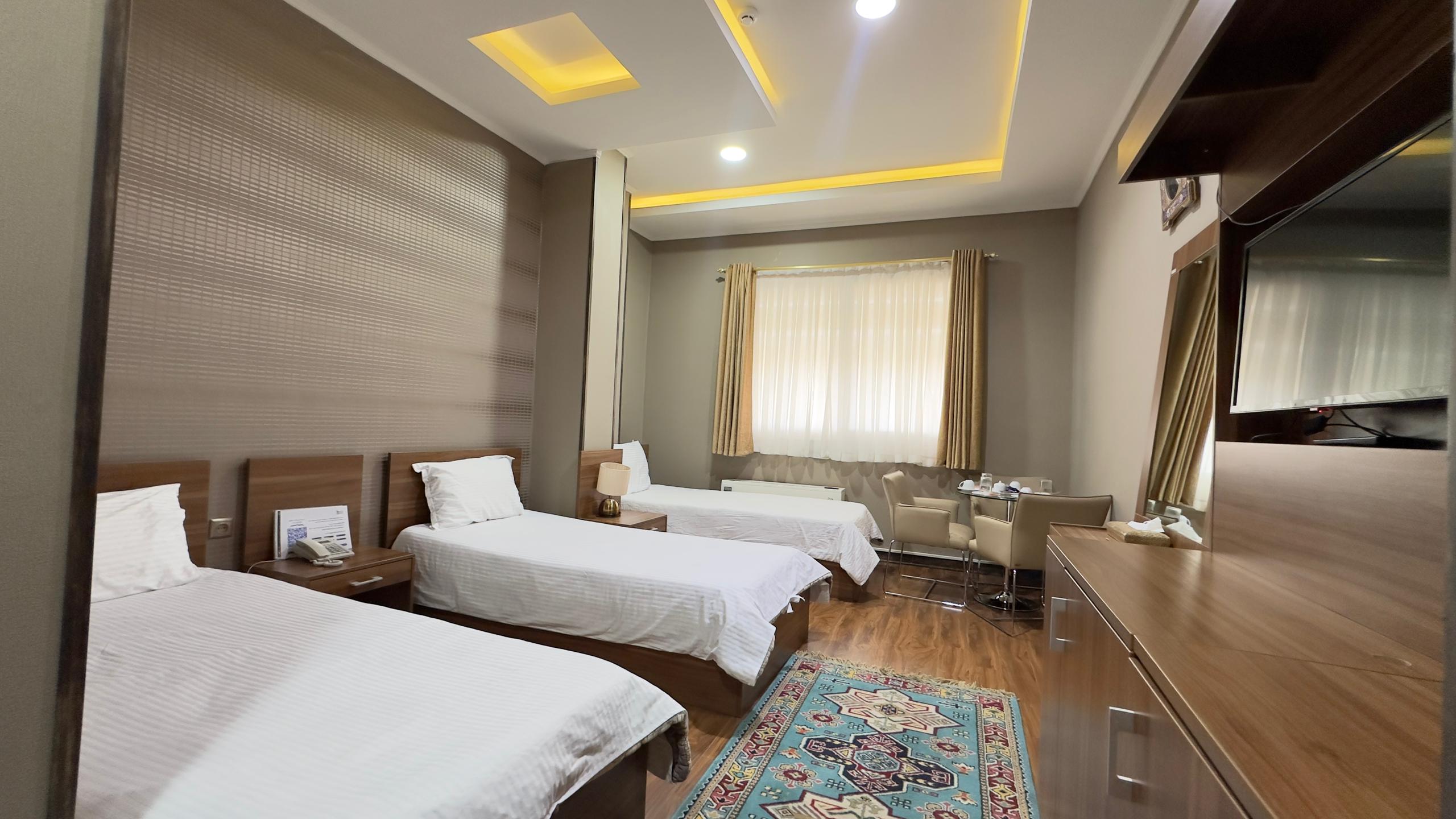 این اتاق شامل سه تخت یک نفره همراه با دمپایی ، حوله ، مینی بار یخچال ، سرویس چای و توالت فرنگی ( توالت ایرانی در سالن ) واقع در طبقه 4 هتل و خانه داری 24 ساعته