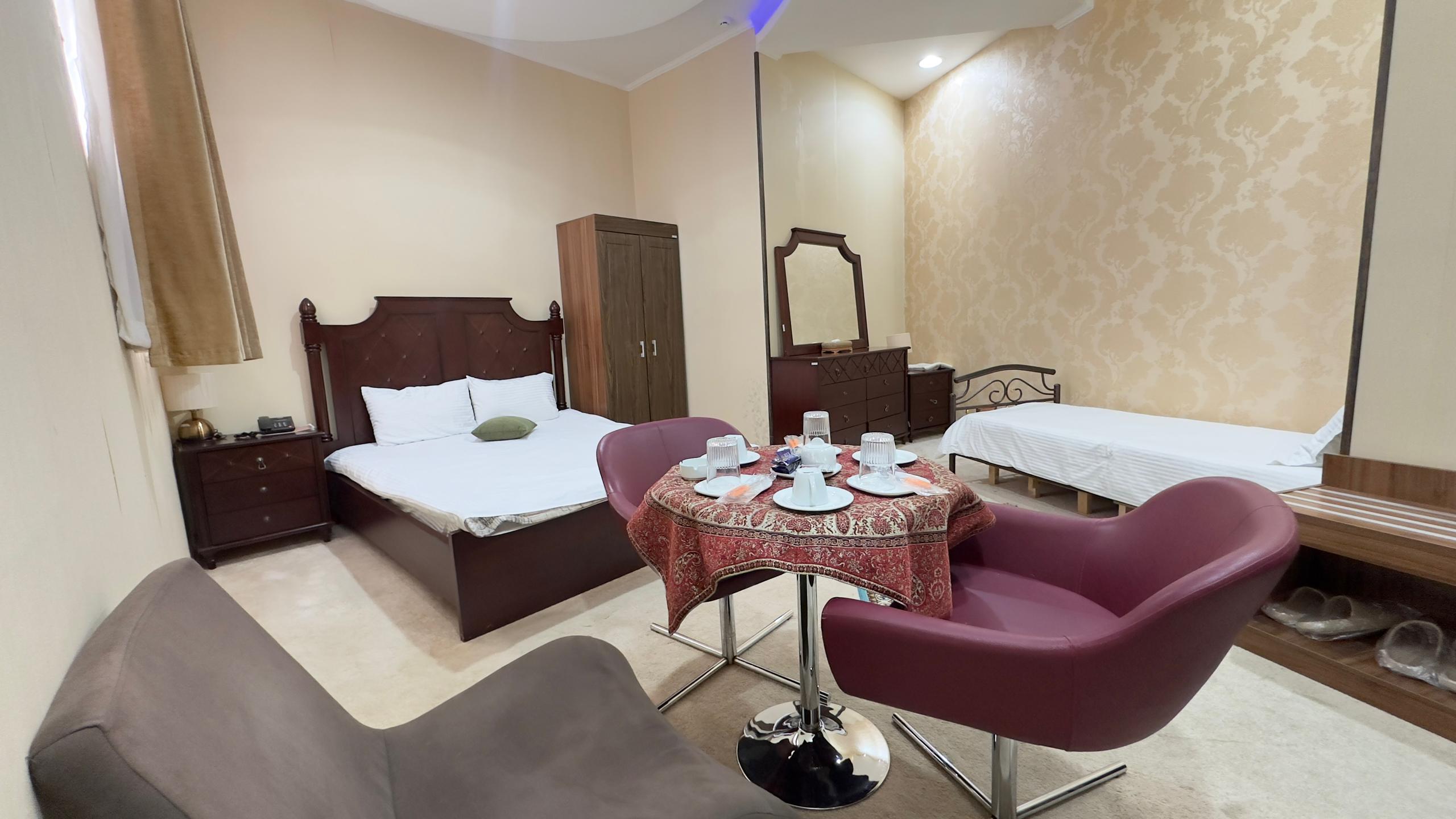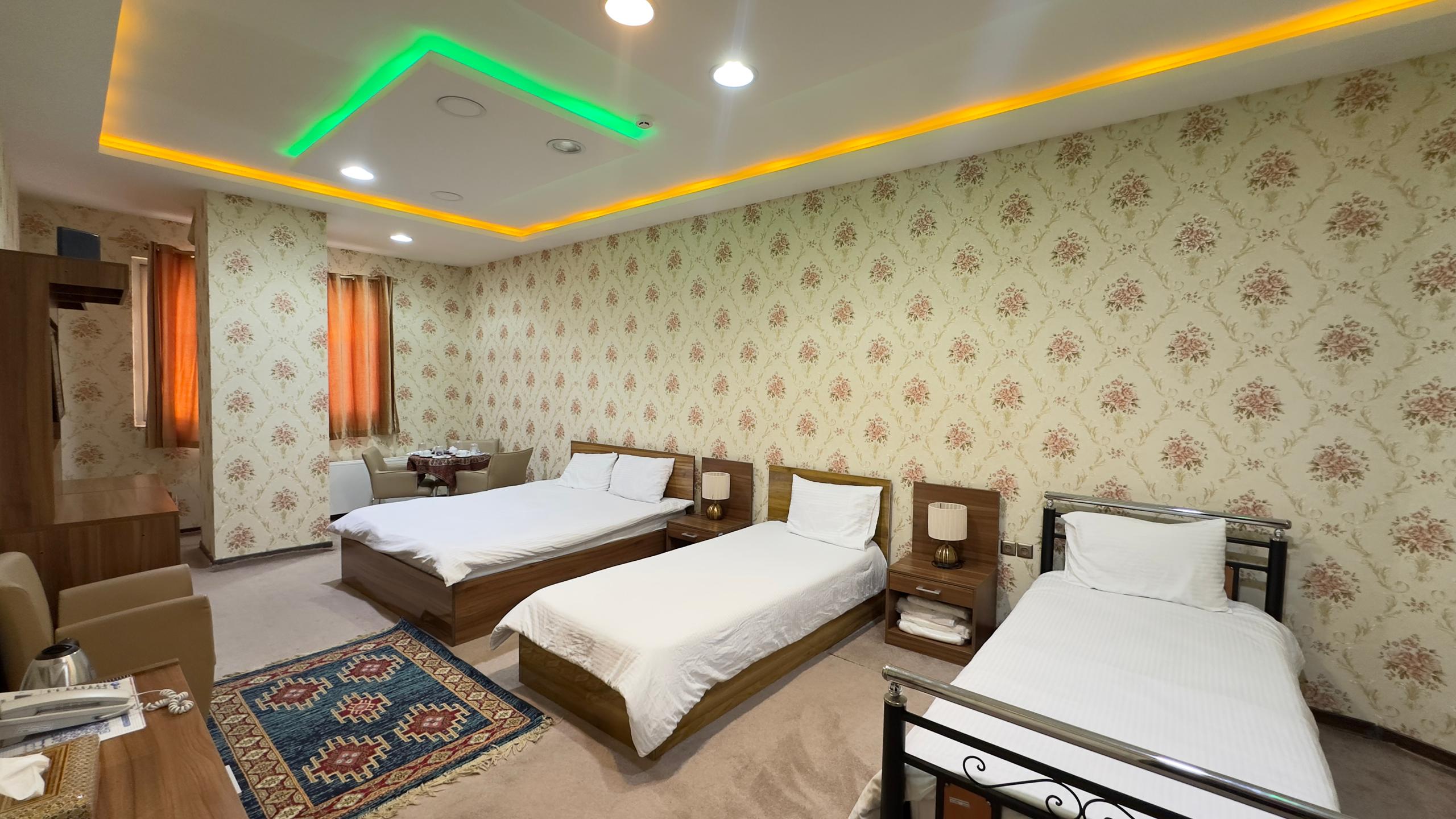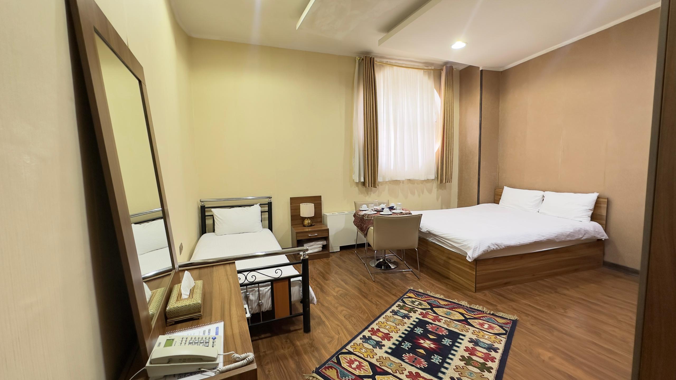 این اتاق شامل یک تخت دو نفره و دو تخت یک نفره همراه با دمپایی ، حوله ، مینی بار یخچال ، سرویس چای و توالت فرنگی ( توالت ایرانی در سالن ) واقع در طبقه 4 هتل و خانه داری 24 ساعته